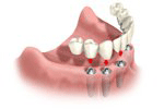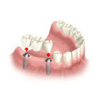 Auch größere Zahnlücken zwischen gesunden Zähnen können heute mit Zahnimplantaten versorgt werden. Dazu werden die Implantate an die Stelle der entfernten Zahnwurzeln gesetzt und später mit einer Brücke oder mit einzelnen Kronen vollendet.